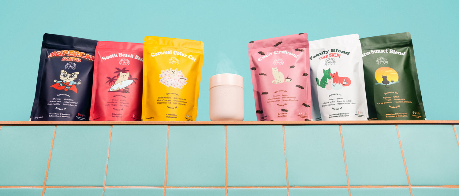 At Dums Coffee, we aspire to democratize the perception that good coffee should be luxurious and expensive. We distinguish ourselves with a colorful and fun brand image. Each of our coffees is symbolized by a cat evolving in a unique environment based on the flavors and emotions it arouses. Our goal is to make specialty coffee accessible to everyone.